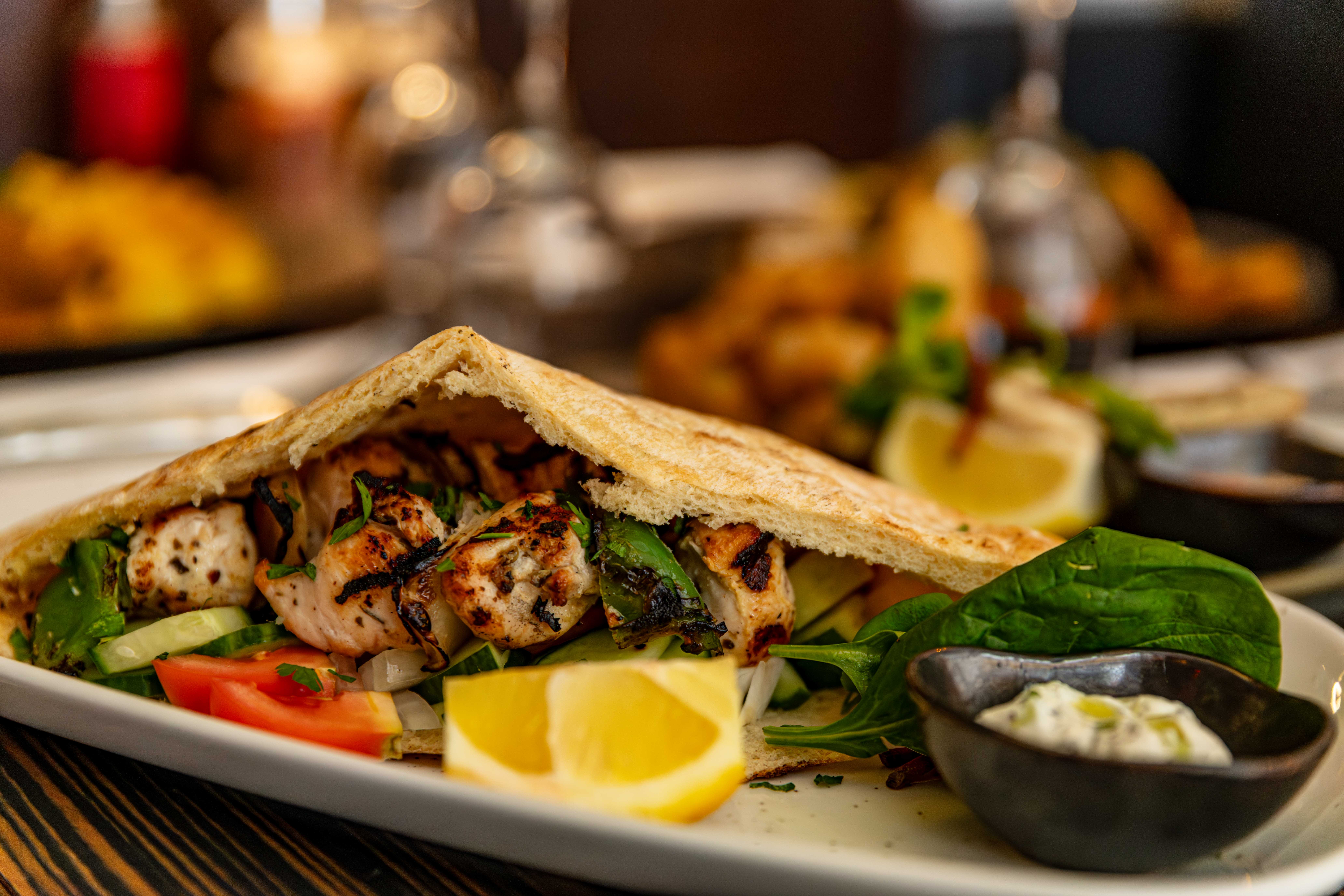 Succulent chicken pieces grilled on skewers served with warm Cypriot pitta bread or on a bed of rice