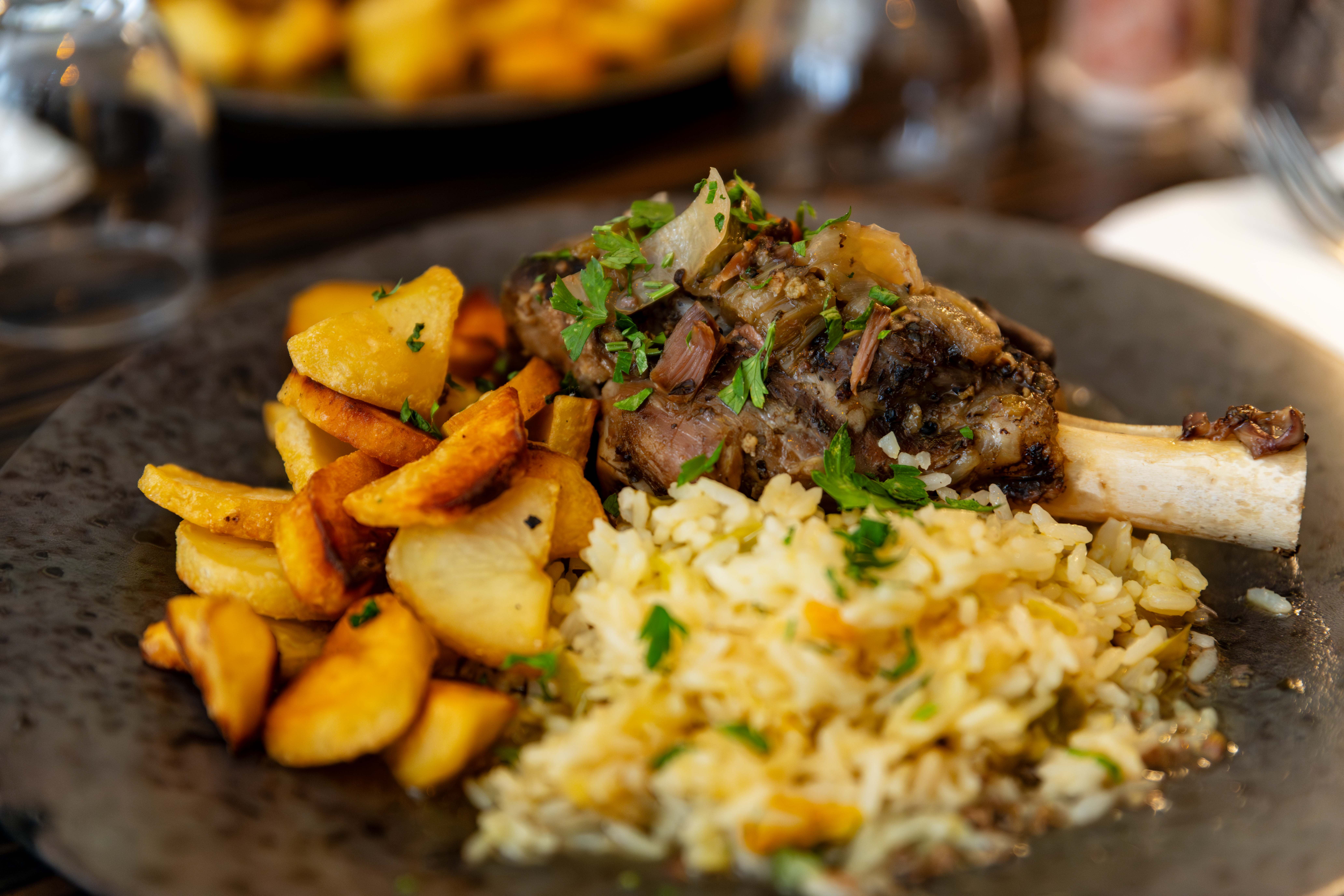 Lamb on the bone oven cooked with mixed herbs and spices, served with saute potatoes and rice